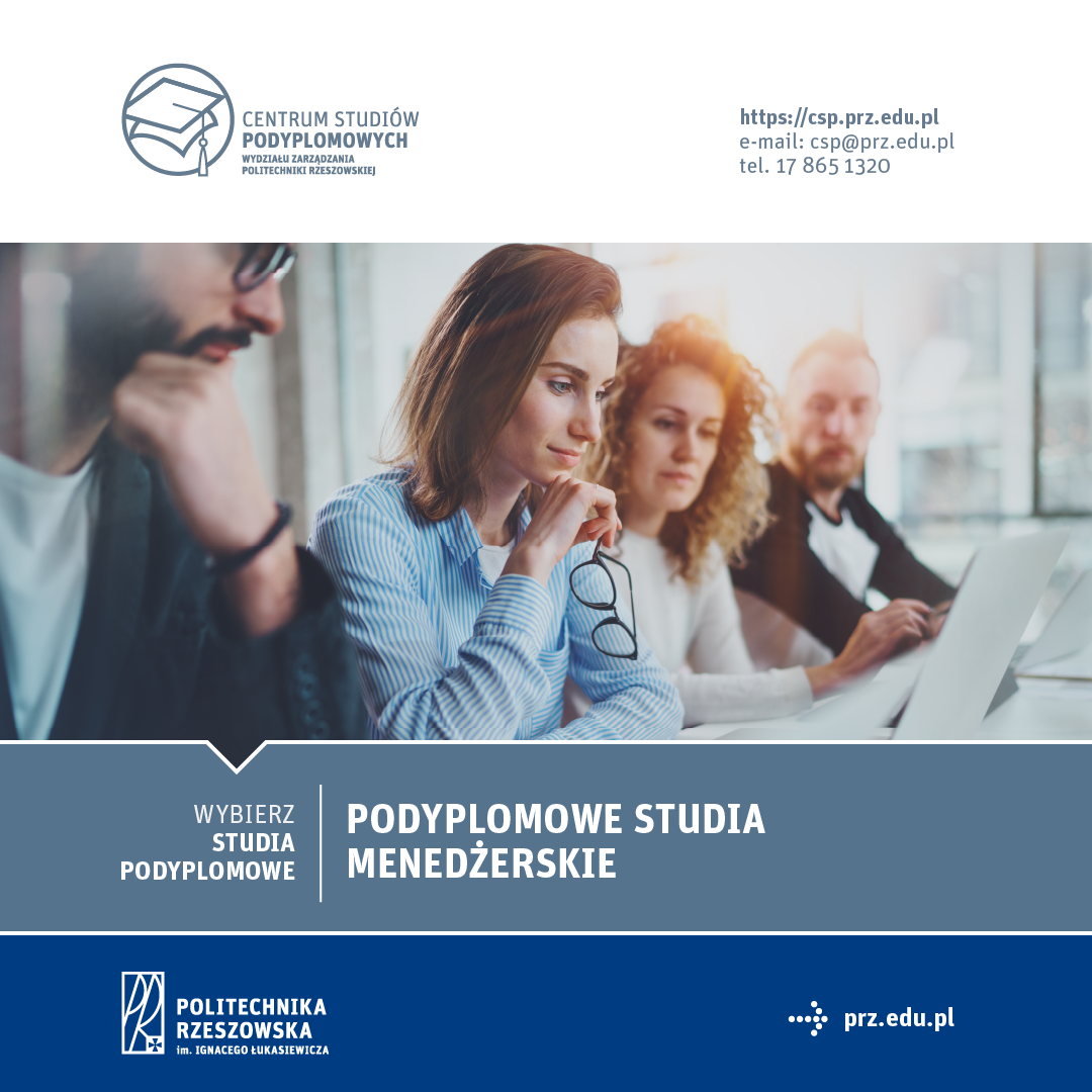 W Centrum Studiów Podyplomowych Wydział Zarządzania Politechniki Rzeszowskiej im. Ignacego Łukasiewicza uruchomiliśmy właśnie nabór na Podyplomowe studia menedżerskie, dzięki którym można uzyskać praktyczną wiedzę i umiejętności z zakresu nowoczesnego zarządzania oraz rozwinąć kluczowe kompetencje menedżerskie.