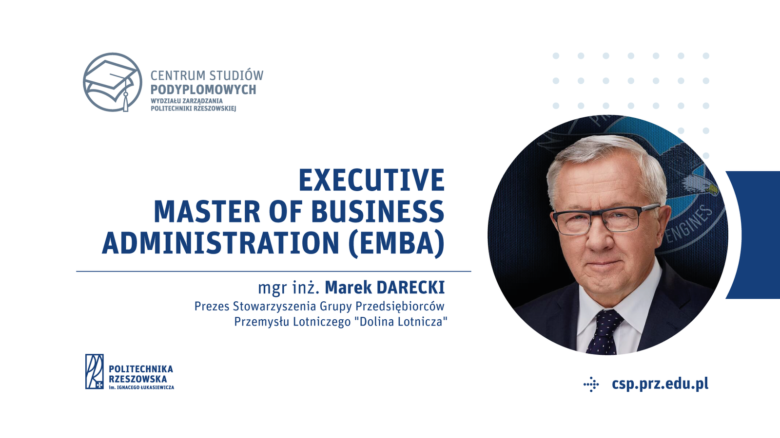 W ramach nowego kierunku studiów podyplomowych Executive MBA w Centrum Studiów Podyplomowych Wydziału Zarządzania PRz, prezes Stowarzyszenia Dolina Lotnicza, Marek Darecki, poprowadził cykl czterech intensywnych, czterogodzinnych spotkań poświęconych przywództwu strategicznemu. Podczas zajęć dzielił się swoim szerokim doświadczeniem liderskim, wskazując kluczowe kompetencje niezbędne do skutecznego zarządzania organizacją na najwyższym szczeblu. Marek Darecki, inicjator i prezes klastra Dolina Lotnicza, zrzeszającego ponad 180 członków, a także były prezes Pratt & Whitney Rzeszów, wniósł unikalną perspektywę na temat przywództwa w obliczu wyzwań rynkowych i technologicznych.