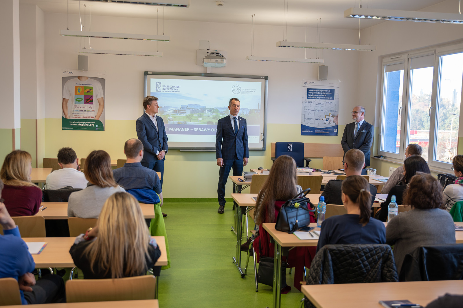Na pierwszym wykładzie słuchaczy przywitał prof. dr hab. Grzegorz Ostasz, kierownik studiów podyplomowych oraz dr Jacek Strojny, koordynator kierunku. Wykład inauguracyjny poprowadził ekspert posiadający wieloletnie doświadczenie w zarządzaniu projektami – mgr inż. Krzysztof Witkowski.