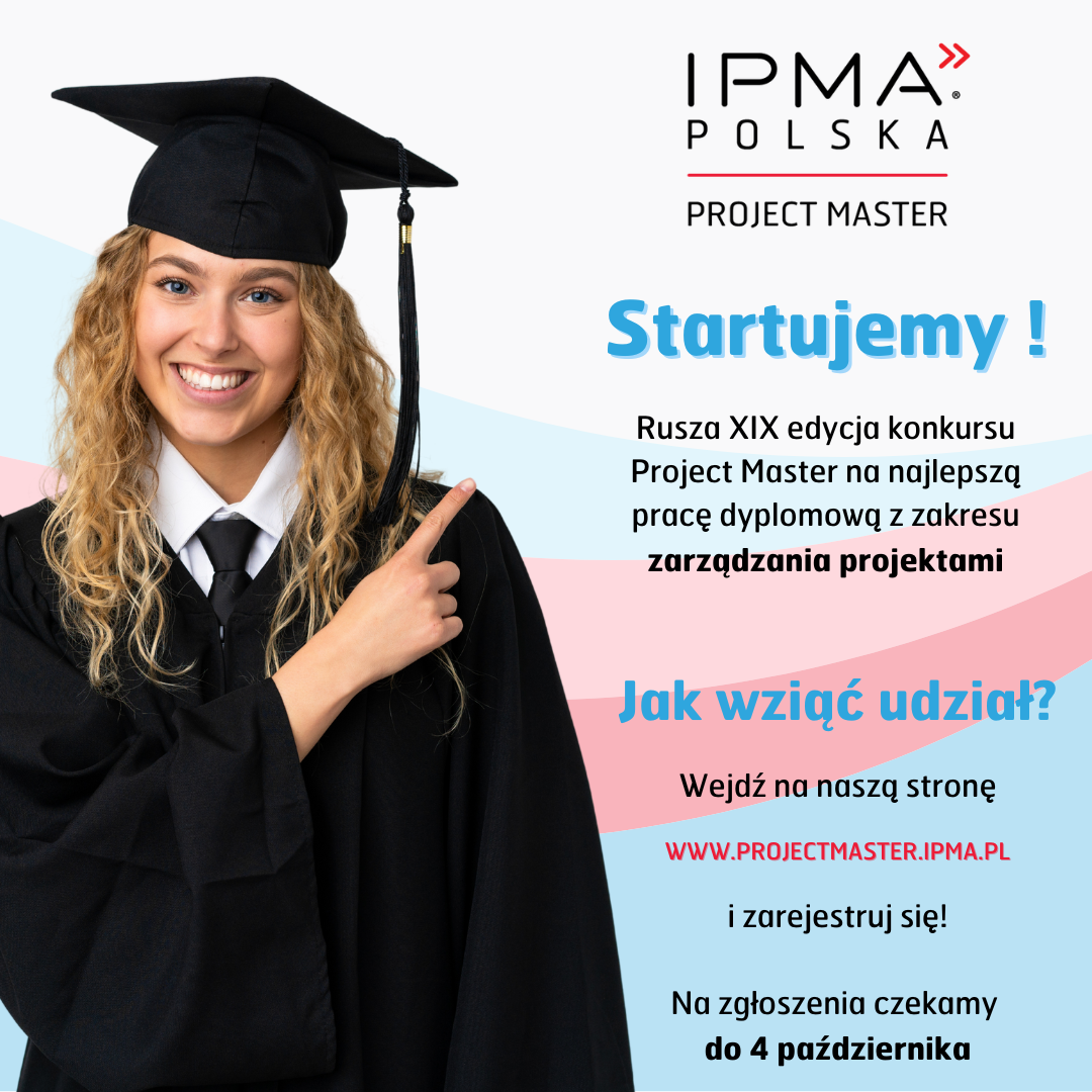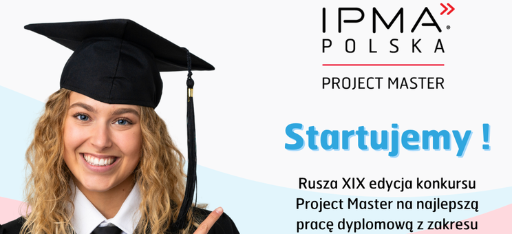 Stowarzyszenie IPMA Polska zaprasza do udziału w XIX Edycji Konkursu Project Master na najlepszą pracę licencjacką, inżynierską, magisterską, podyplomową i doktorską w dziedzinie zarządzania projektami. Konkurs jest organizowany przez IPMA Polska oraz Wydział Ekonomii, Finansów i Zarządzania Uniwersytetu Szczecińskiego. Patronat Honorowy nad Konkursem objęli: Minister Nauki i Szkolnictwa Wyższego, Narodowe Centrum Badań i Rozwoju, Urząd Komunikacji Elektronicznej i Polska Izba Gospodarcza Zaawansowanych Technologii IZTECH.