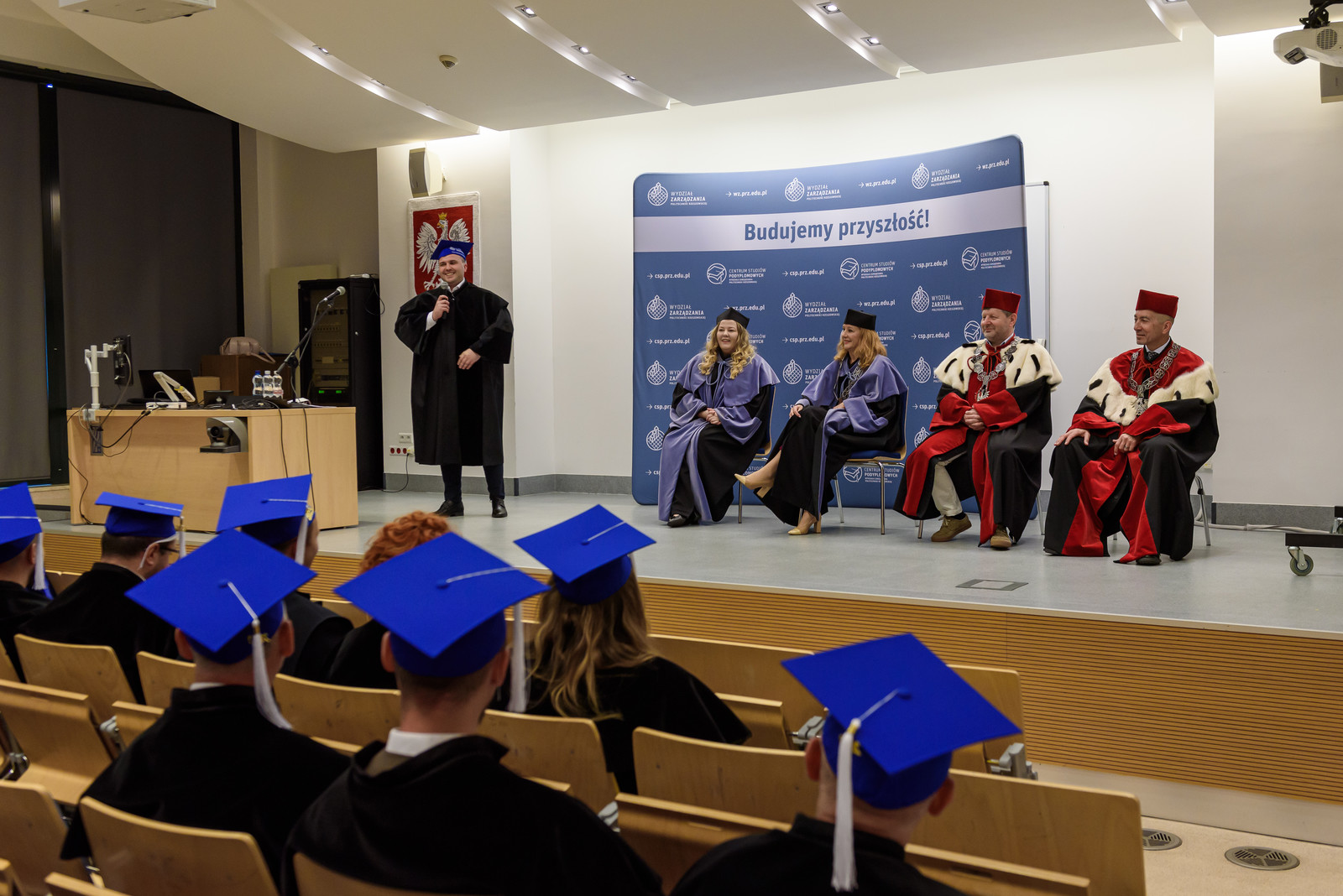 Uroczystość uświetnili swoją obecnością prof. dr hab. inż. Piotr Koszelnik – rektor Politechniki Rzeszowskiej, prof. dr hab. Grzegorz Ostasz – prorektor PRz ds. studenckich i kierownik Centrum Studiów Podyplomowych Wydziału Zarządzania PRz. W ceremonii wzięły udział również: dr hab. Beata Zatwarnicka-Madura, prof. PRz – dziekan Wydziału Zarządzania Politechniki Rzeszowskiej i kierownik studiów MBA oraz dr Justyna Stecko – prodziekan Wydziału Zarządzania ds. kształcenia.