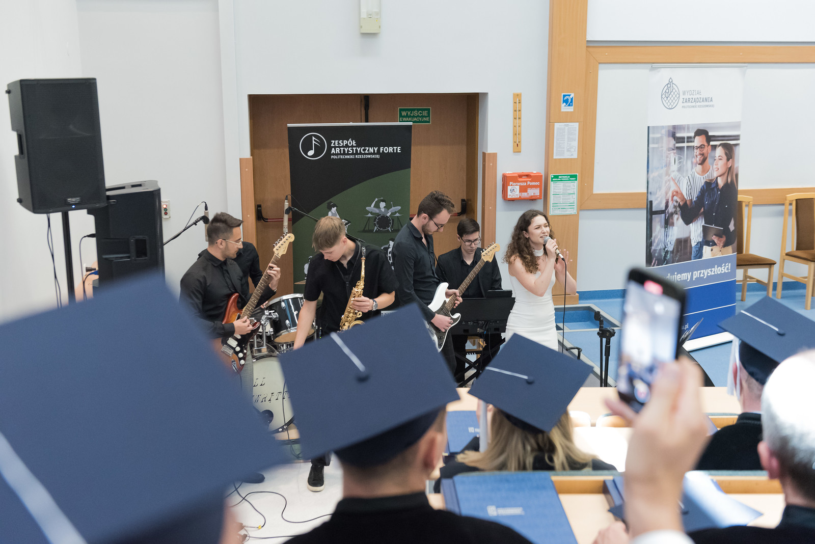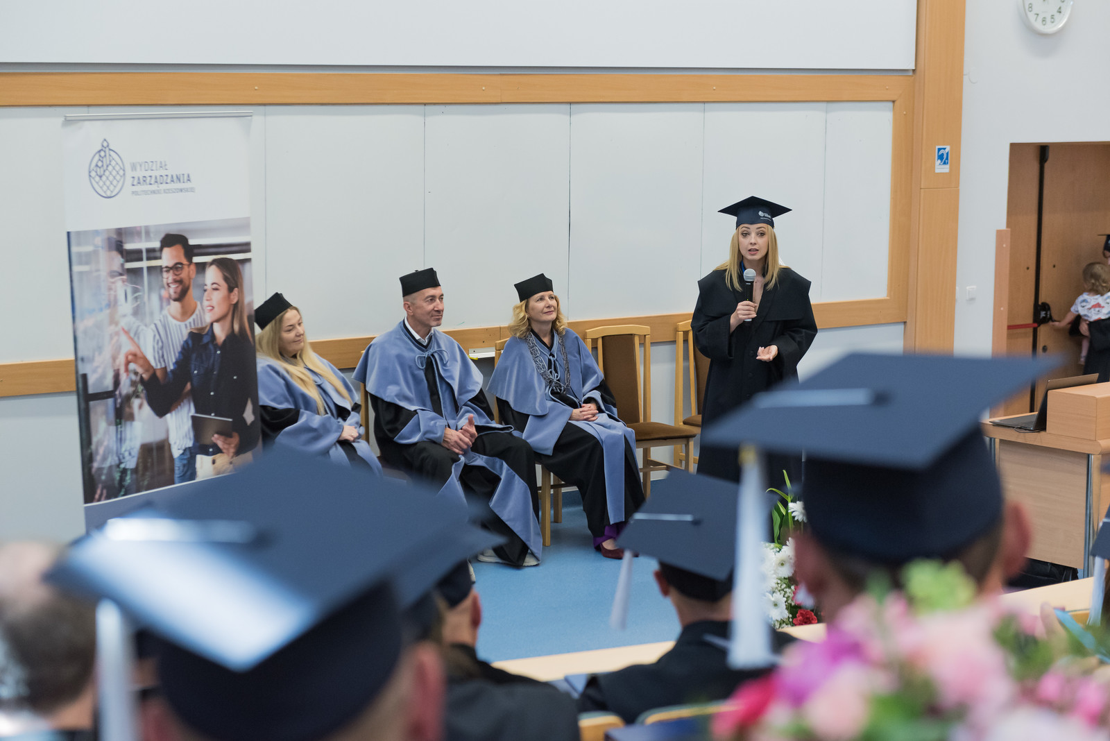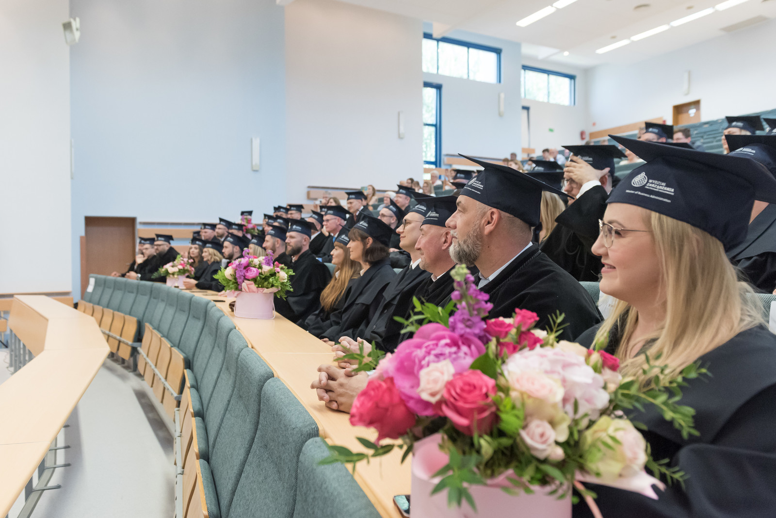 Atmosfera podczas uroczystości była podniosła i pełna radości. Po przemówieniach Władz Uczelni, absolwenci otrzymali świadectwa ukończenia studiów podyplomowych MBA. W imieniu obu grup absolwentów głos zabrały dwie osoby, które podziękowały za wspaniałe doświadczenie, jakim były ukończone studia oraz za rewelacyjną kadrę. Ostatnią część uroczystości wypełnili dźwiękami muzyki członkowie Studenckiego Zespołu Artystycznego FORTE. Na koniec wykonano pamiątkowe zdjęcia w togach i biretach.